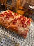 thick square, garlic, our special pizza sauce with cheese all the way to edges topped with pepperoni cups on top!
