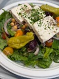 Romaine lettuce, Greek Olives, Cucumbers, red onion, plum tomato bell peppers, chickpeas, Greek Feta & banana peppers topped with extra virgin olive oil, oregano & parsley garnish